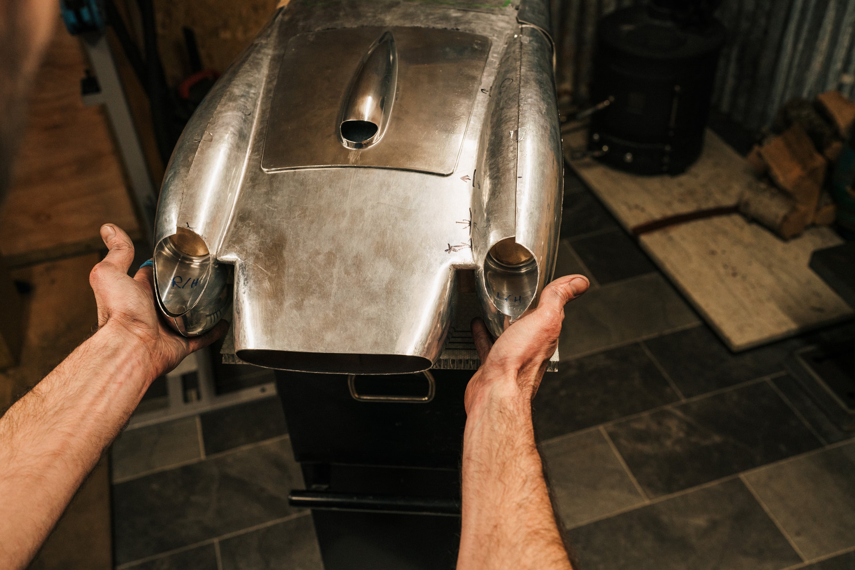 - Hammered from aluminium sheet by hand using traditional carrosserie skills