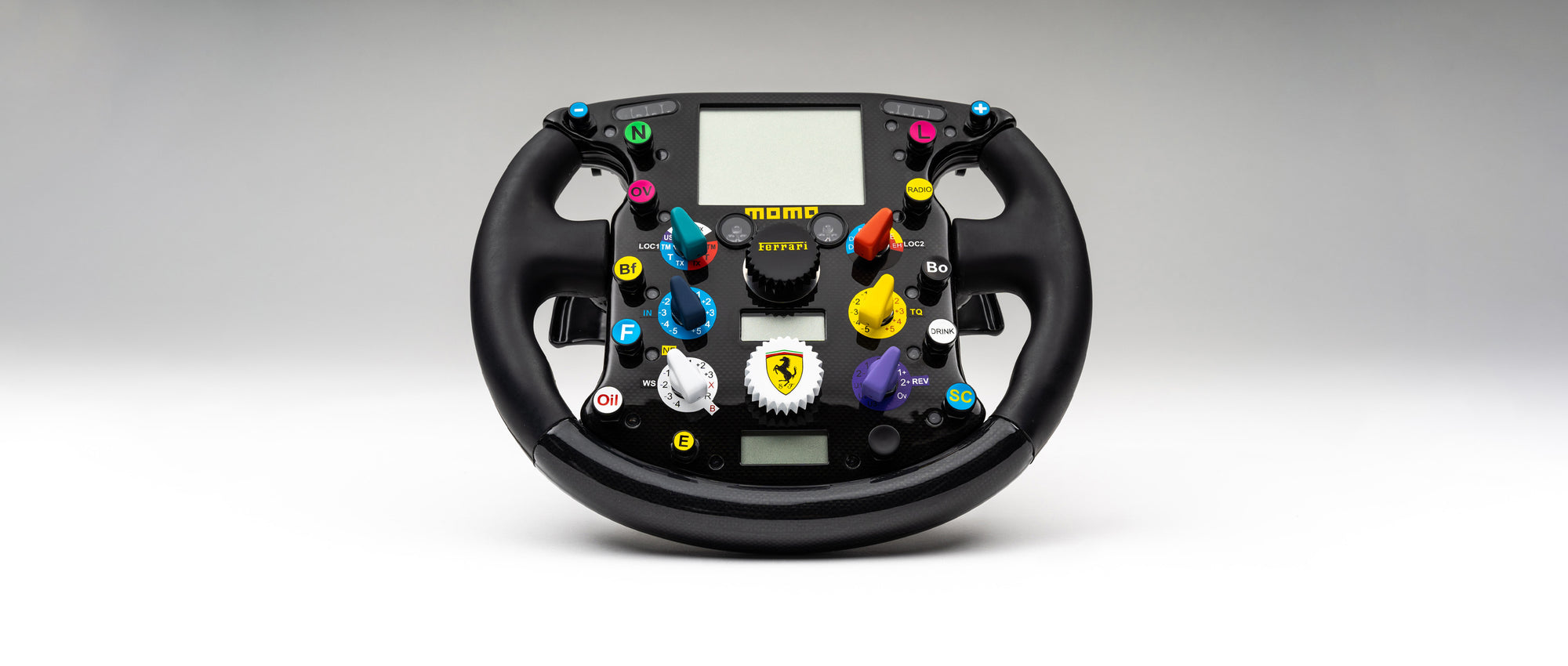 This fine model is a 1:1 scale collector’s replica of the Ferrari F2004 steering wheel from the 2004 season with working buttons, switches and paddles as piloted by Michael Schumacher and Rubens Barichello. The F2004 gave the team it's 6th straight Constructors' Championship and 5th straight Drivers' Championship for Michael Schumacher. A F2004M also contested the first two races of the 2005 season. This replica has been hand-crafted utilising the original CAD data supplied directly by Ferrari GES and has undergone strict scrutiny by both the design and engineering teams to ensure complete accuracy in both weight and look and feel.