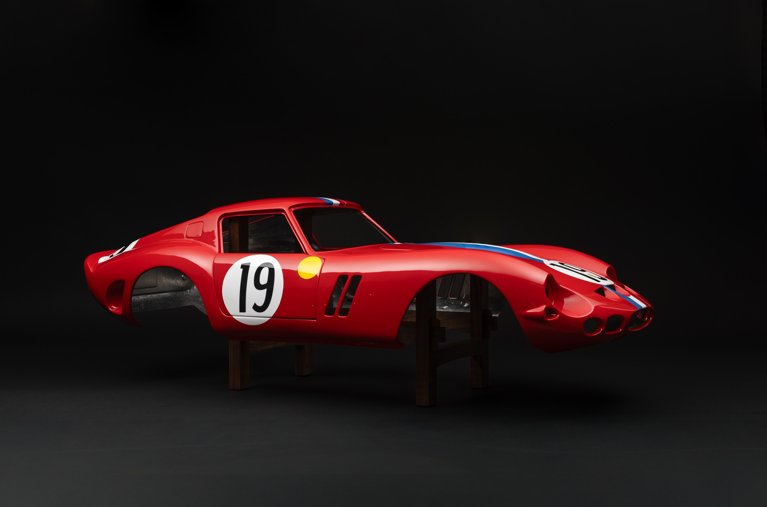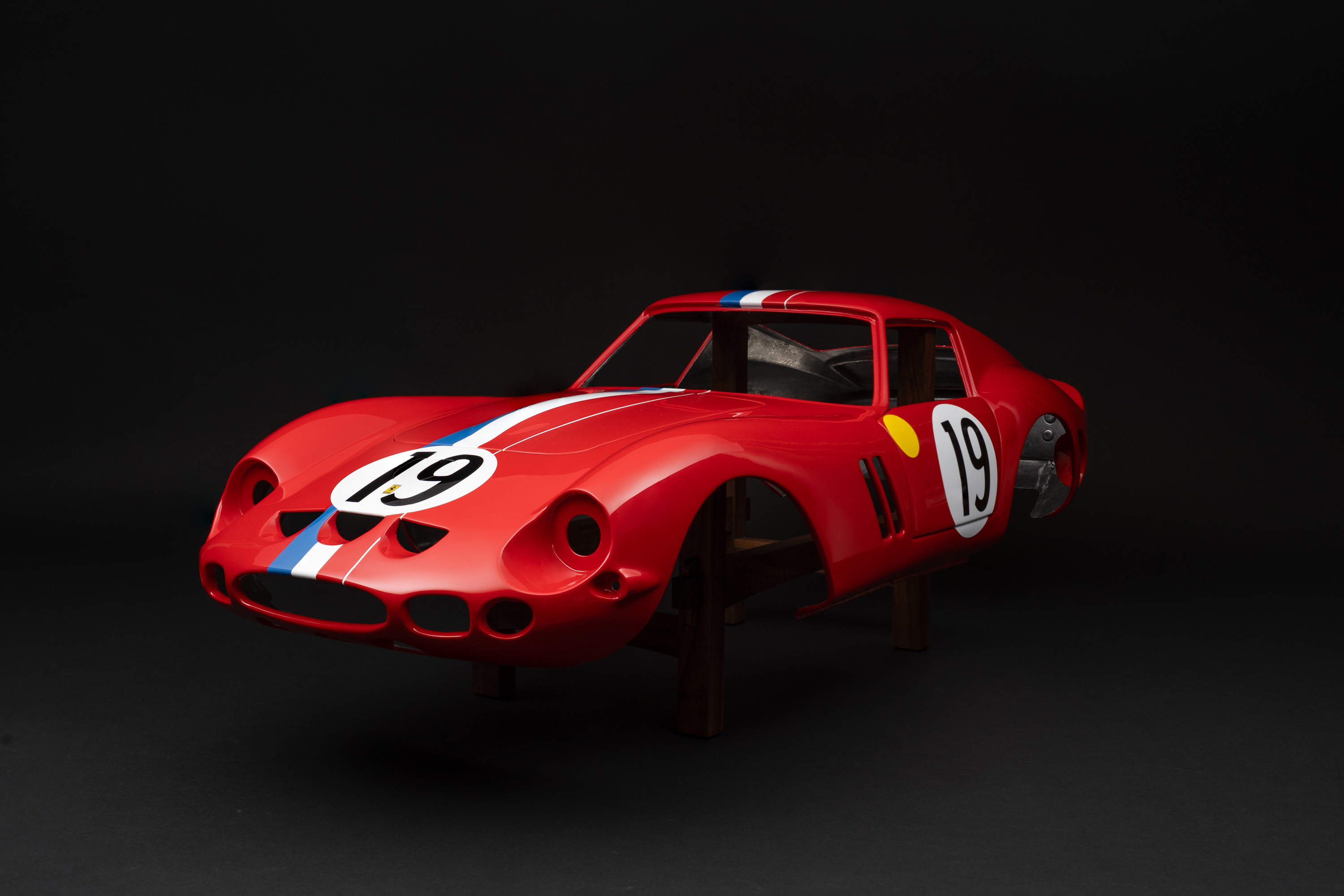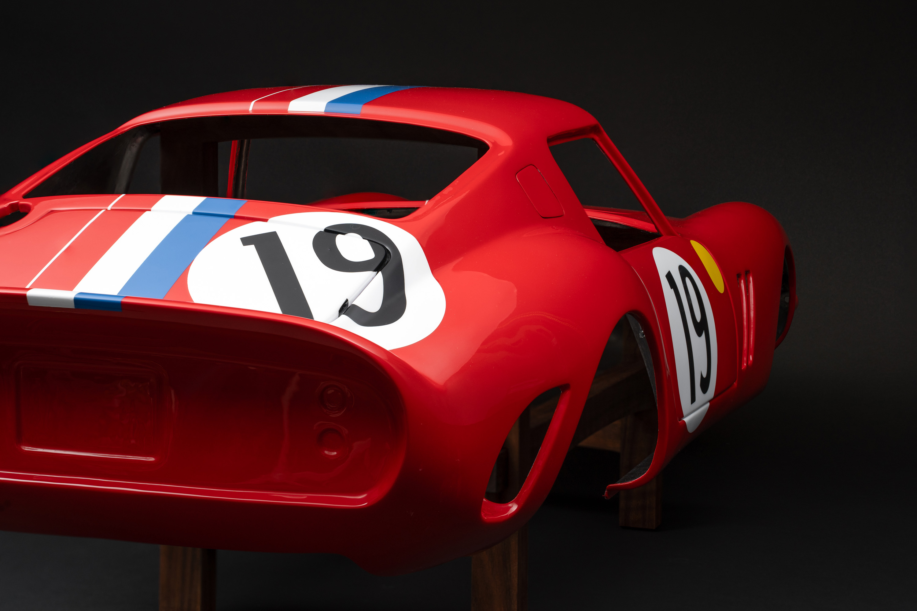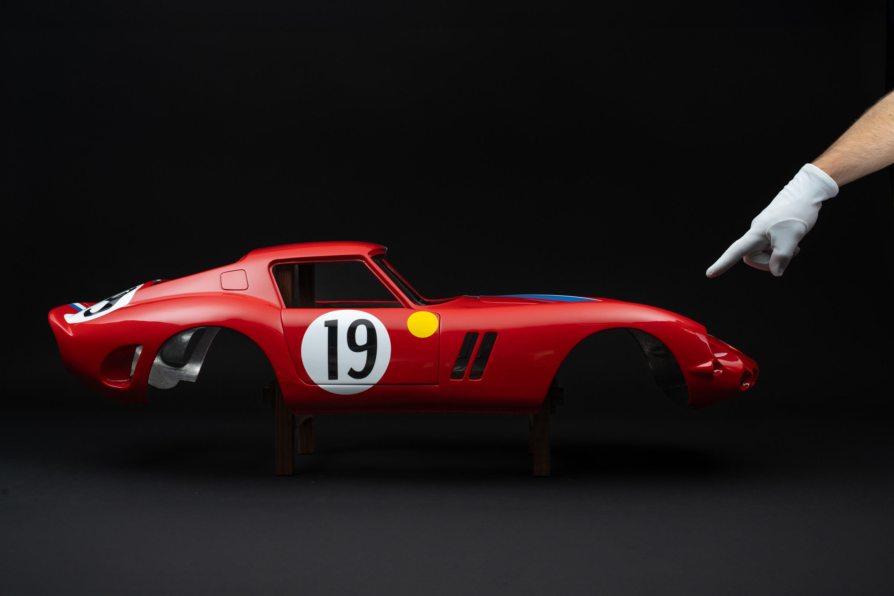 我们已经制作了几个 1:8 比例的汽车的精美模型,但为了充分展现车身外形的美感,我们现在制作了一个手工锤制的 250 GTO 车身的铝制复制品,其尺寸为真车尺寸的四分之一。